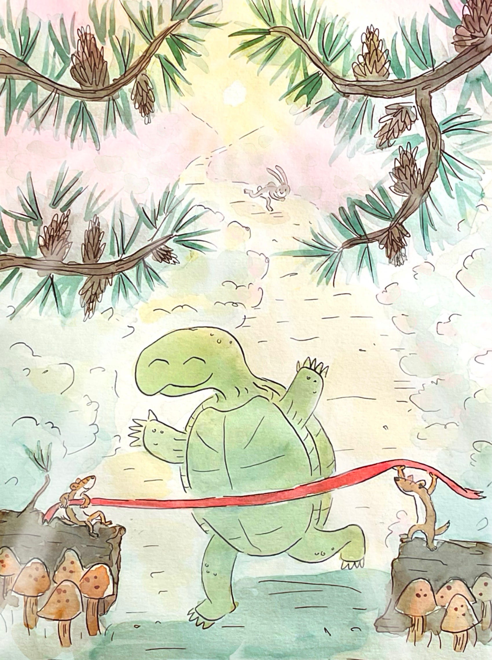 New to this kind of challenge—a themed prompt for each day of the week—I decided to jump into Folktale Week 2025. I’d already been sketching desert turtles and jackrabbits for a separate project, so that naturally pulled me toward The Tortoise and the Hare. It served as a good folktale/fable framework to build on, while also giving me an excuse to draw more animals, something I’ve been wanting to do more of.